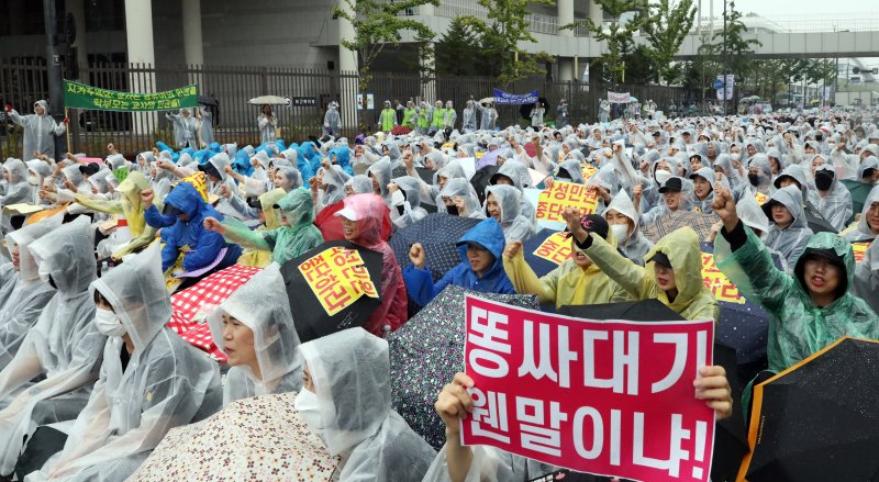 (세종=뉴스1) 장동열 기자 = 20일 오후 세종시 어진동 정부종합청사 보건복지부 앞에 검은 옷과 비옷 차림의 전국 어린이집 원장과 교사 3000명(주최측 추산)이 모였다.