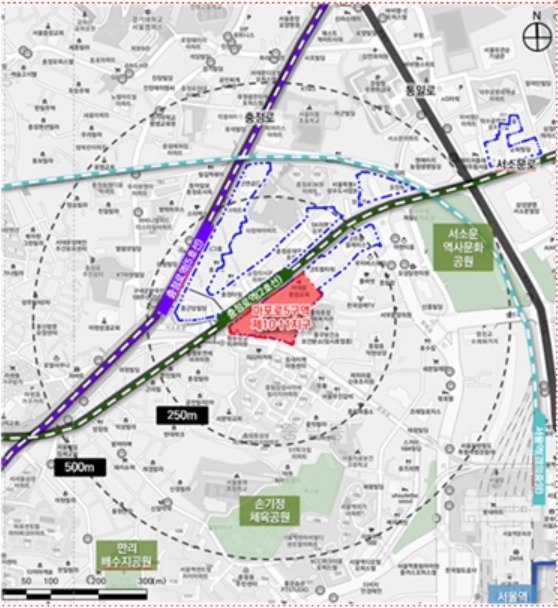 (서울=뉴스1) 최서윤 기자 = 중구 중림동과 순화동, 서대문구 충정로 3가 일대 아직 재정비가 이뤄지지 않은 마포로5구역 10·11지구가 공동주택, 업무시설, 공원 등으로 정비된다. 지하철 2호선 충정로역 출입구는 지하연계복합건축물로 거듭난다.