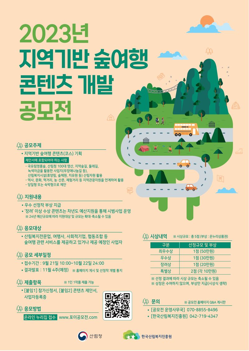 이번 공모전은 지역 특색을 반영한 숲여행 우수 콘텐츠를 개발하고 ‘숲여행’ 사업에 대한 국민 인지도를 높여 지역 상생을 이루기위해 마련됐다.