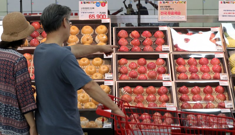 다만 도매가격이 높게 형성되고 있어도 정부의 할인 지원과 유통업계의 자체 할인 노력으로 소비자 가격은 안정세를 찾았다는 게 정부의 설명이다. 이달 중순 소매가 기준 사과 홍로 10개는 전년보다 0.2% 감소한 2만9663원, 배 신고 10개는 31.3% 감소한 2만7946원이다.