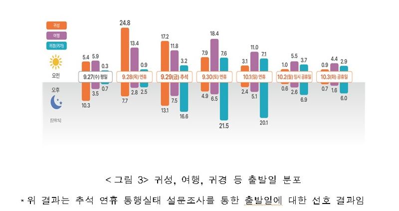 귀성 출발은 추석 전날인 28일 오전, 귀경 출발은 추석 다음날인 30일 오후가 가장 혼잡할 것으로 예상된다. 이동시 92%가 승용차를 이용해 이동할 것으로 보인다. 이어 버스, 철도, 항공, 해운 순이다.