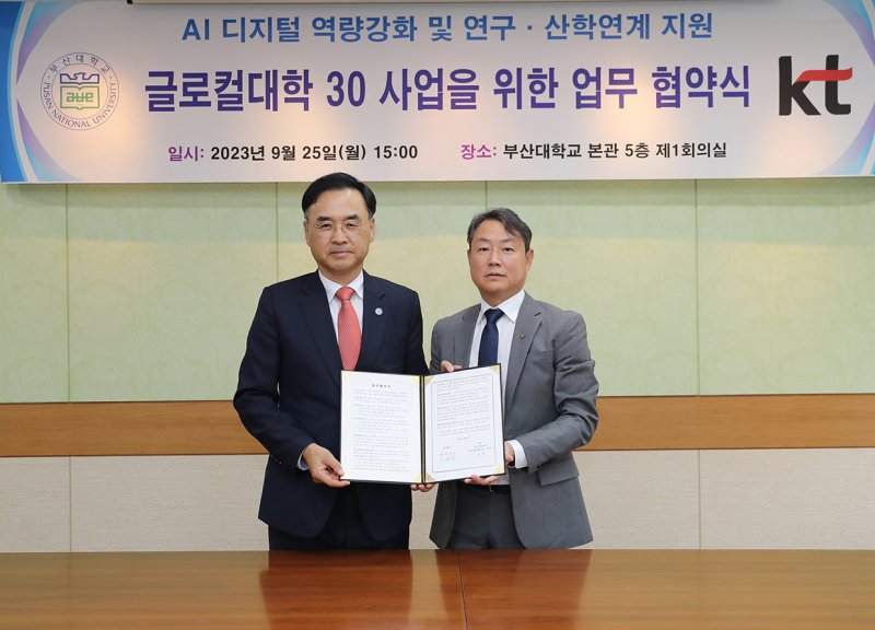 [부산=뉴시스]김민지 기자 = 부산대학교는 25일 오후 대학본부에서 KT와 인공지능(AI) 디지털 역량 강화 및 연구·산학연계 등을 위한 업무협약(MOU)을 체결했다.