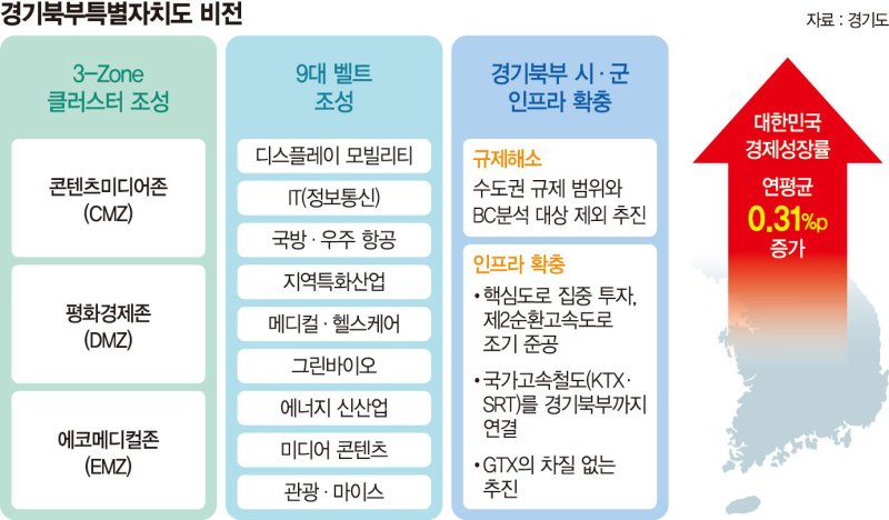 특히 경기도는 '대한민국 경제성장률 연평균 0.31%p 증가' 목표로 △3-Zone(콘텐츠미디어존(CMZ), 평화경제존(DMZ), 에코메디컬존(EMZ) 클러스터 조성 △9대 벨트(디스플레이 모빌리티, IT(정보통신), 국방·우주 항공, 지역특화산업, 메디컬·헬스케어, 그린바이오, 에너지 신산업, 미디어 콘텐츠, 관광·마이스) 조성 △경기북부 시·군 인프라 확충 등 3대 전략을 추진할 계획이다.