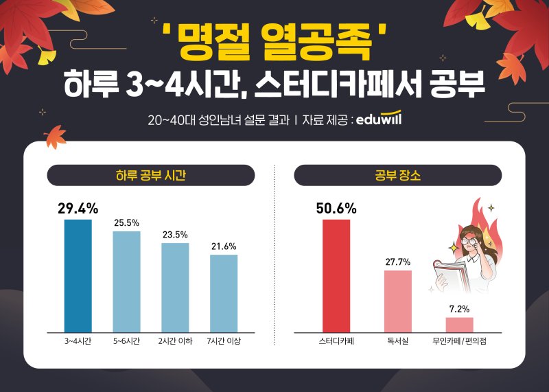 추석 연휴에 가족이나 친척을 피해 공부하려는 장소를 묻는 질문에 절반이 넘는 50.6%가 '스터디카페'라고 응답했다.
