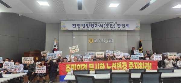 하지만 지난 25일 열린 주민 공청회가 주민들의 단상 점검 등 강력한 반대로 무산됐다. 머리띠를 두르고 피켓과 함께 참석한 주민들은 "두 차례 주민 설명회에서 요구한 노선 변경 요구에 대해 뚜렷한 답이 없다"며 거세게 항의했다.