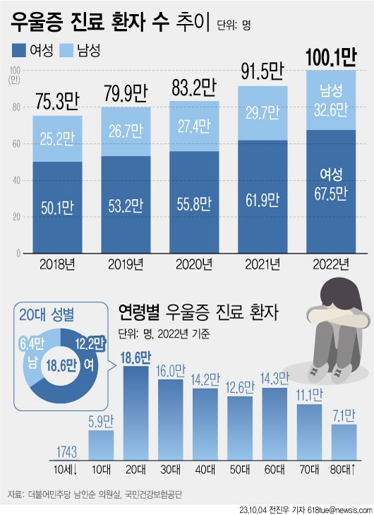 최근 5년간 우울증 진료 환자 수는 2018년 75만2976명에서 2019년 79만9011명, 2020년 83만2378명, 2021년 91만5298명, 2022년 100만744명이다.