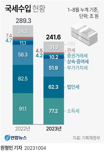 4일 기획재정부가 발표한 '8월 국세수입 현황'에 따르면 1~8월 누적 국세수입은 241조6000억원으로 지난해보다 47조6000억원 줄었다. 8월 국세수입도 24조원에 그치며 전년 동월보다 4조3000억원 감소했다.