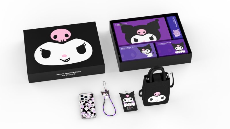 아이폰15 쿠로미 패키지는 아이폰15와 아이폰15 프로를 쿠로미 캐릭터로 꾸밀 수 있는 폰케이스, 스트랩, 카드지갑, 미니백 4종으로 구성했다.