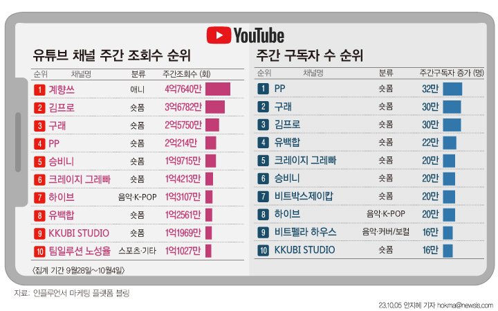 10월 첫째주 튜브가이드 국내 유튜브 채널 랭킹
