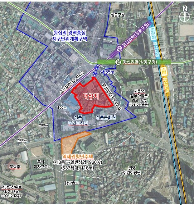 성동구 행당동 248번지 일대 왕십리역세권4 특별계획구역은 '왕십리 광역중심 지구단위계획구역' 내 왕십리역 9번 출구와 연접한 환승역세권이다. 왕십리로와 고산자로 교차부에 위치한 교통 요지임에도, 노후 불량 건축물이 다수 분포해 광역중심에 걸맞은 상업·교통중심지로의 육성과 주거환경 개선이 시급했다고 서울시는 설명했다.