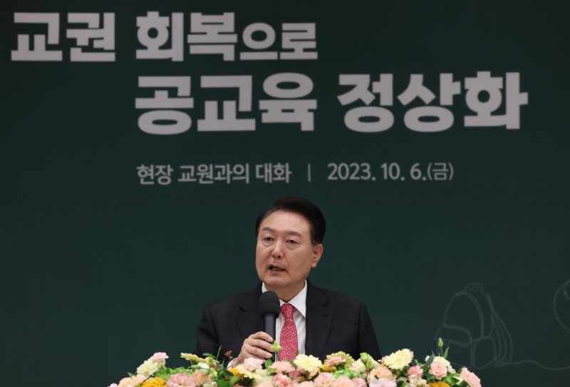 [서울=뉴시스] 전신 기자 = 윤석열 대통령이 6일 서울 용산 대통령실 청사에서 열린 교권 보호 4법 계기 현장 교원과의 대화에서 발언하고 있다. (대통령실통신사진기자단) 2023.10.06. photo1006@newsis.com [서울=뉴시스] 류현주 기자 = 윤석열 대통령이 6일 교권 보호 4법 개정을 계기로 현장 교원과의 간담회를 가졌다.