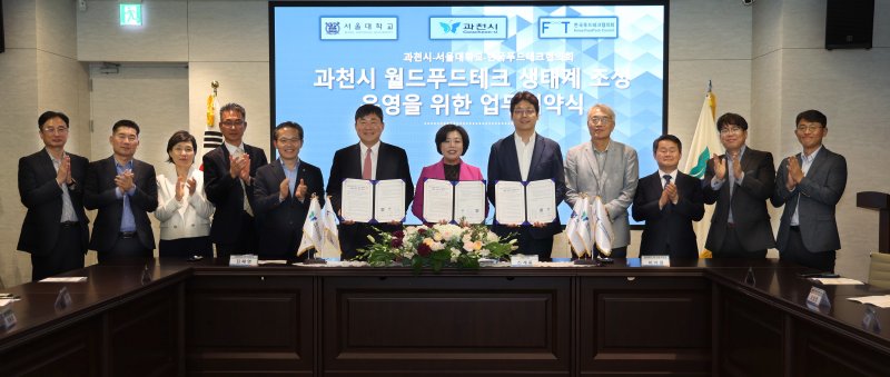 과천시는 6일 관내 디테크타워 미래 홀에서 서울대학교 산학협력단, 한국 푸드테크협의회와 ‘월드푸드 테크센터 설립 및 푸드테크 혁신 특구 조성을 위한 업무협약’을 체결했다.