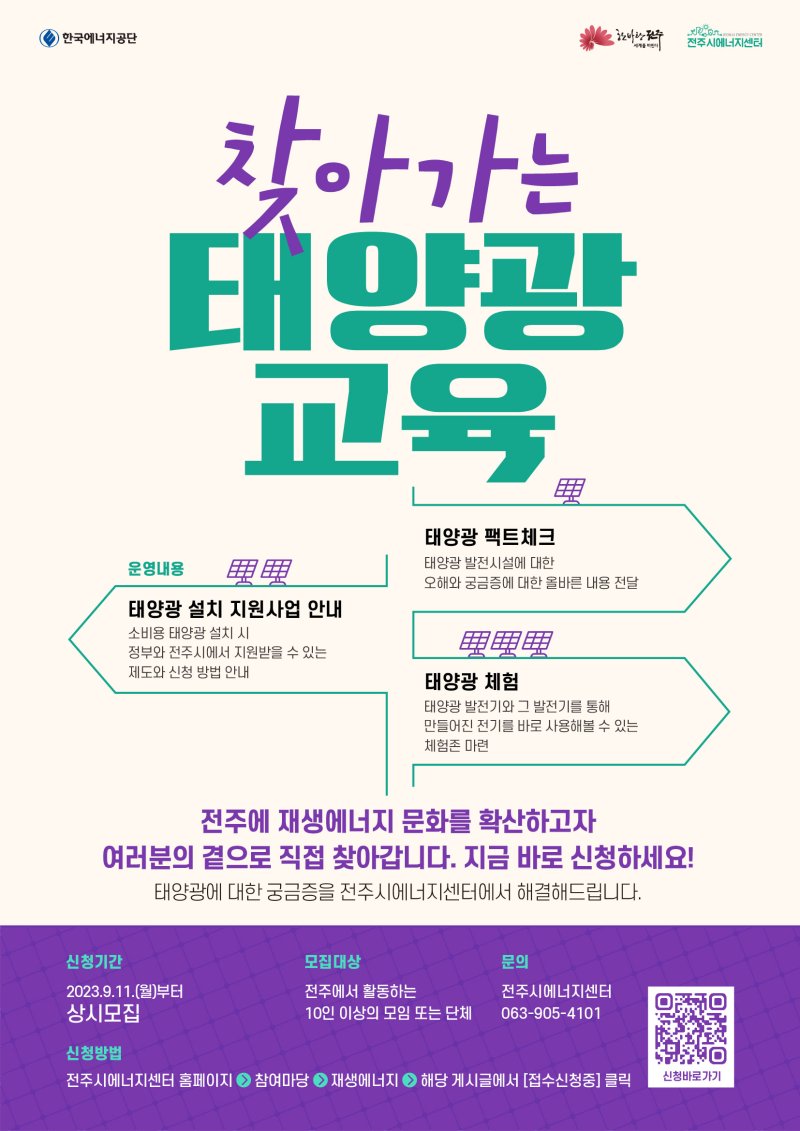 센터 관계자는 "이번 교육을 통해 전주시민들의 태양광에 대한 잘못된 오해를 바로잡는 것은 물론 재생에너지에 대한 긍정적인 인식과 문화가 확산할 수 있을 것"이라고 말했다.