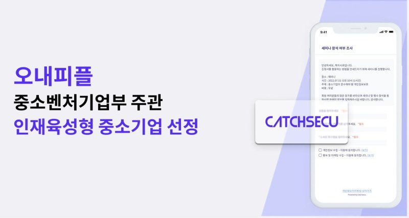 [서울=뉴시스]송혜리 기자 = 개인정보보호 규제 관리 자동화 솔루션 캐치시큐 운영사 오내피플은 중소벤처기업부가 주관하는 '인재육성형 중소기업'에 선정됐다고 11일 밝혔다.