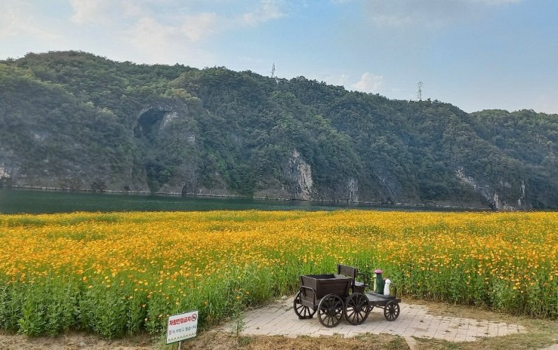 지난달 말부터 코스모스와 백일홍을 비롯해 댑싸리 등 가을꽃들이 만개하면서 도담삼봉을 배경으로 가을을 즐기려는 관광객들의 발길이 줄을 잇고 있다.