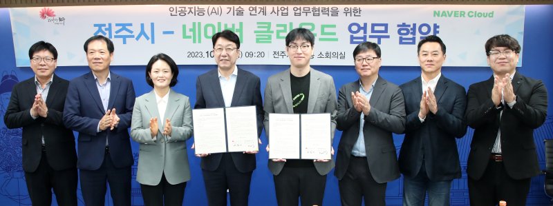 전주시는 13일 시청에서 우범기 전주시장과 하정우 네이버클라우드 AI 혁신센터장 등이 참석해 네이버 클라우드 플랫폼을 활용한 AI 기술 활용 사업 발굴과 자문, 교육 등 행정 전반에 협력하기로 협약을 체결했다.