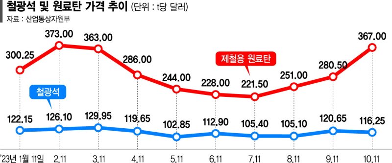 산업통상자원부에 따르면 지난 11일 기준 철광석 가격은 t당 116.25달러를 기록했다 이는 올해 최저점을 찍었던 지난 5월 말 97.35달러와 비교해 20% 가량 증가한 수치다. 지난 11일 기준 제철용 원료탄 가격 역시 367달러를 기록해 올해 7월 최저 가격이었던 221달러 대비 66% 상승했다.