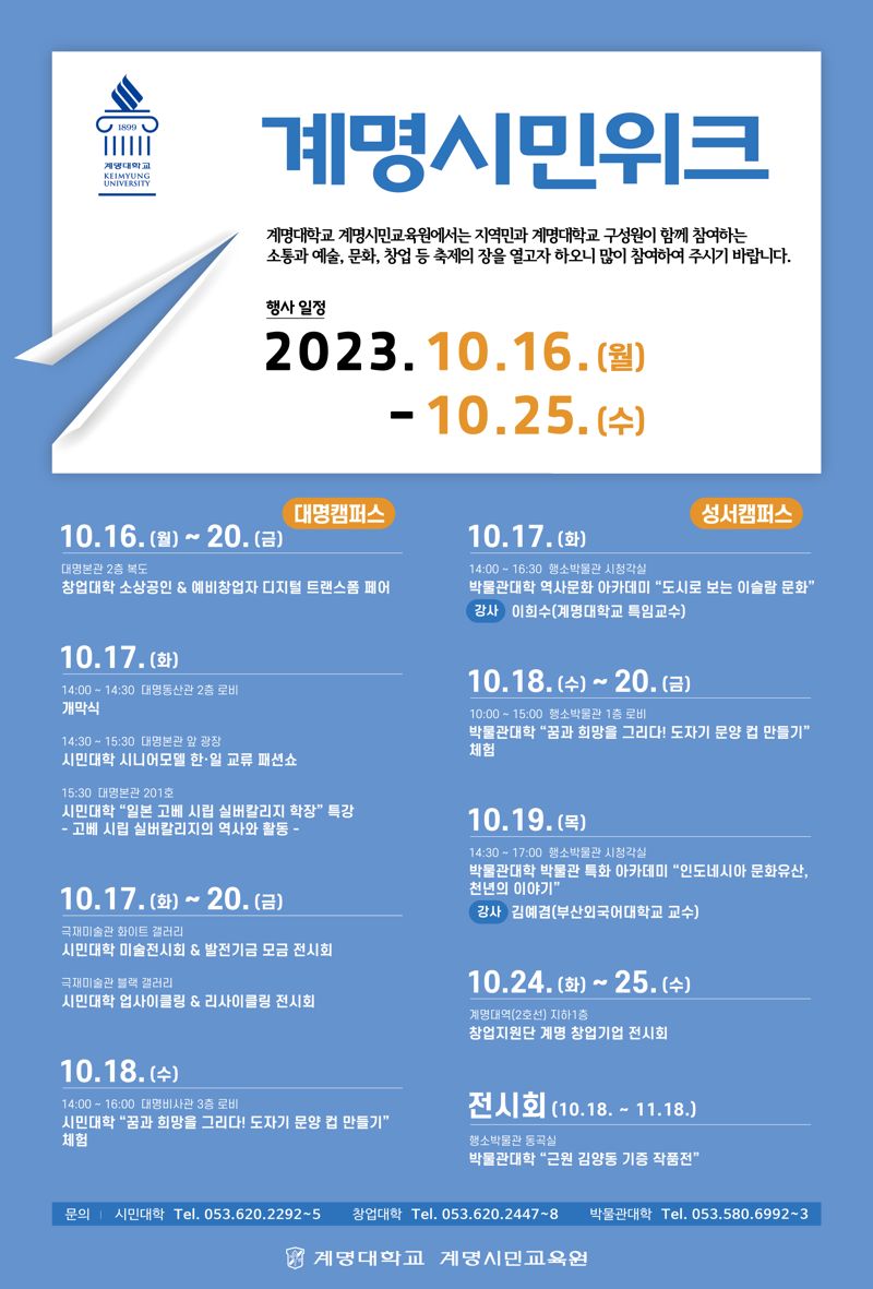 16일 계명대 계명시민교육원은 오는 11월 18일까지 계명대 성서캠프스와 대명캠퍼스에서 지역민들과 함께하는 '계명시민위크' 행사를 개최한다고 밝혔다.