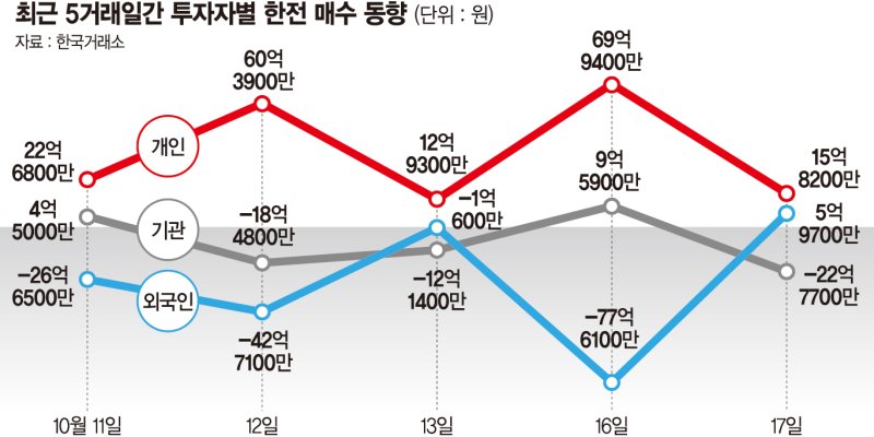 개인은 3·4분기 실적발표를 앞두고 최근 5거래일 간 한국전력의 주식을 사들이고 있다. 이 기간 순매수 대금은 181억원이다.