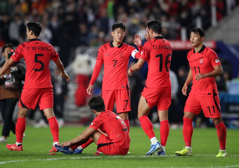 [수원=뉴시스] 조성우 기자 = 17일 오후 경기 수원월드컵경기장에서 열린 하나은행 초청 축구 국가대표 평가전 대한민국과 베트남의 경기, 대한민국 손흥민 등 선수들이 6-0으로 승리한 뒤 기쁨을 나누고 있다. 2023.10.17. xconfind@newsis.com [서울=뉴시스] 류현주 조성우 정병혁 황준선 기자 = 위르겐 클린스만 감독이 이끄는 한국 축구 국가대표팀이 베트남을 상대로 6-0 완승을 거뒀다.