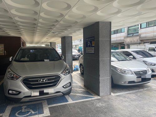 용두동에는 노후 빌라가 밀집한 주택가가 있다. 평일 오후에 방문했음에도 골목은 이미 '만차' 수준이었다. 양방향 골목길은 물론 차 한 대가 겨우 지나갈 수 있을법한 골목에도 차가 주차돼 있었다. 장애인 주차 구역이 있는 11곳 중 3곳에서 불법 주차된 차량을 발견했다.