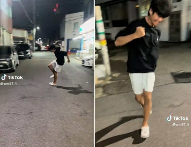 아이디 'wm87.4'로 올라온 10초 분량의 영상을 보면, 이 남성은 원형으로 돌면서 껑충껑충 뛰는 모습이 마치 미끄러지듯 공중부양을 하는 것처럼 보인다. 발끝은 살짝 들어 올려 빠른 발재간으로 경쾌함까지 선보인다.