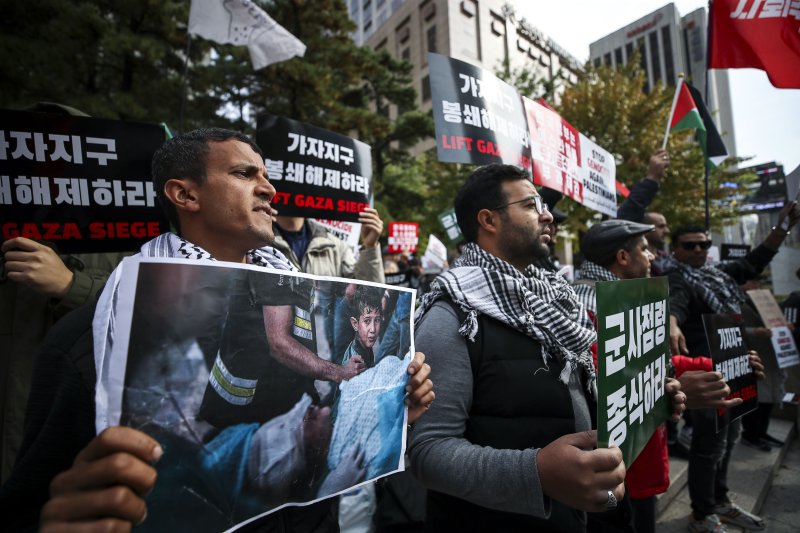 [서울=뉴시스]박광온 기자 = 이스라엘과 팔레스타인 무장 정파 하마스 간 전쟁이 격화되는 가운데, 한국 거주 팔레스타인인들과 시민단체가 집회를 열고 이스라엘의 가자지구 폭격을 규탄했다.