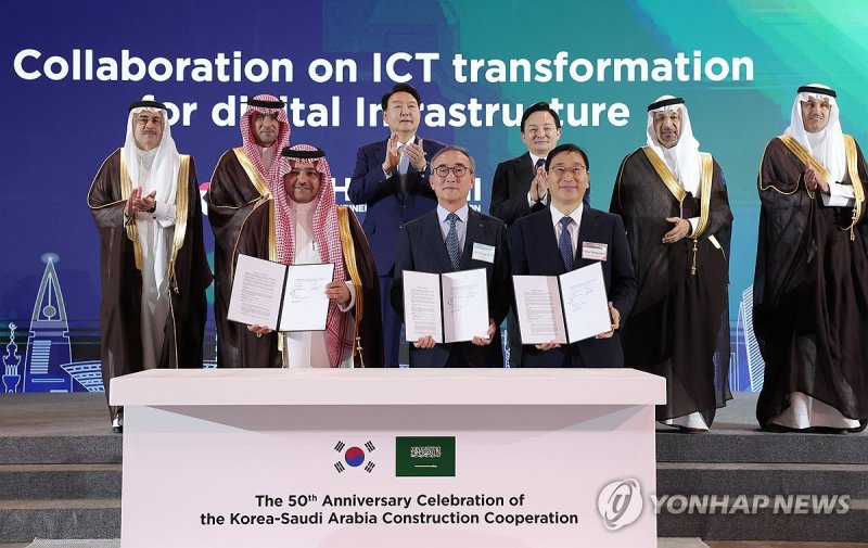 KT는 지난 23일(현지시간) 국토교통부 주관으로 사우디 리야드에서 열린 한국-사우디 건설 협력 50주년 기념행사에 참석해 현대건설, 사우디 stc그룹과 '사우디 디지털 인프라 발전 및 구축을 위한 업무협약(MOU)'을 체결했다고 24일 밝혔다.