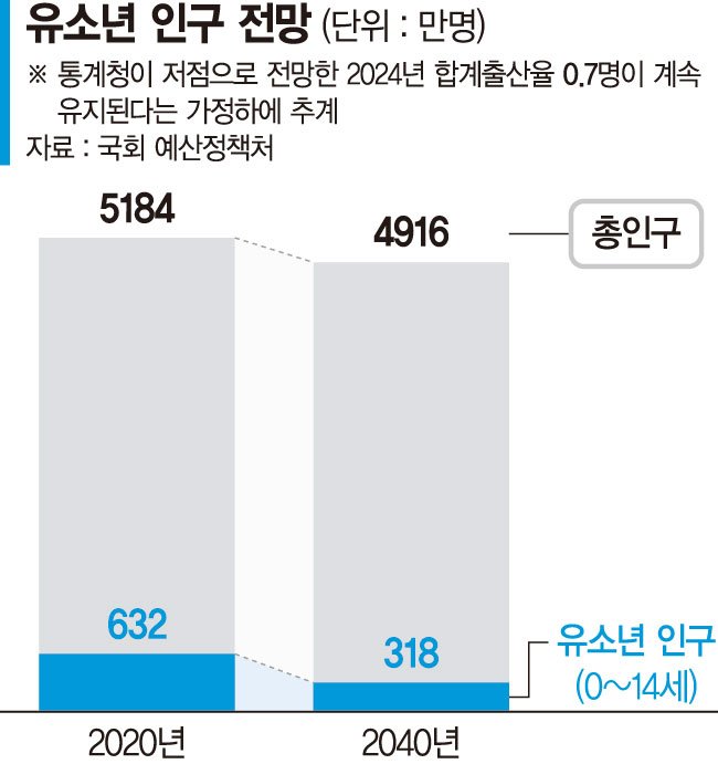 국회 예산정책처는 24일 '최근 저출산 추이를 반영한 총인구 추계' 보고서에서 출산율이 반등하지 못한다면 오는 2040년 국내 유소년 인구가 현재의 절반 수준으로 쪼그라들 것이라고 전망했다.