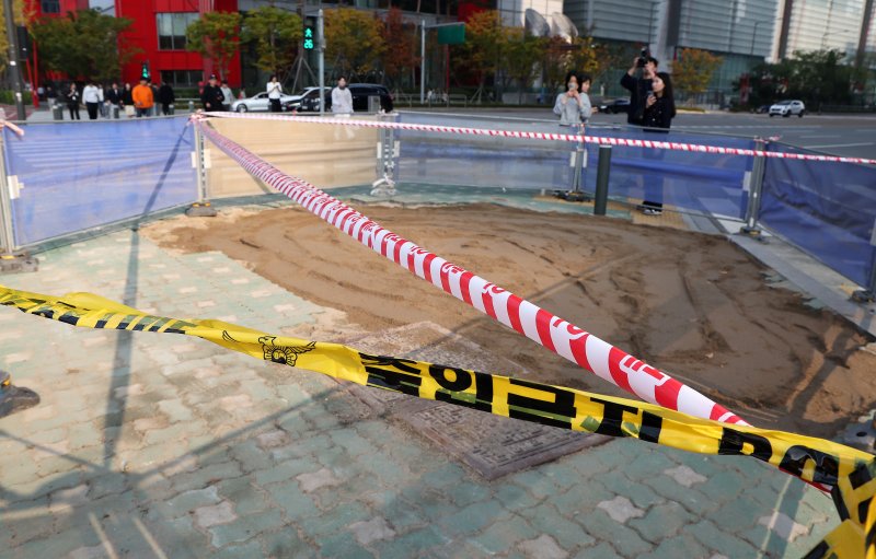 이날 오후 4시쯤 찾아간 싱크홀 발생 장소 인근은 구멍을 모레로 임시로 메워둔 모습이었다.