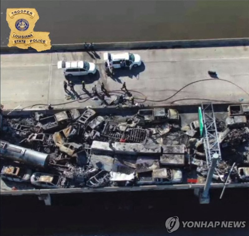 지난 23일(현지시간) 미 루이지애나 고속도로 연쇄 추돌사고 현장 This still image obtained from a handout video released by the Lousiana State Police on Facebook shows burned vehicles after a fire erupted following a crash on Interstate 55 highway in St. John the Baptist Parish, Louisiana, on October 23, 2023. A large cloud of fog enveloping a highway led to at least 158 car crashes and seven deaths in the southern US state of Louisiana, authorities said. The so-called "super fog," which US media reported was caused by a mixture of marsh fires and dense fog, led to a massive pileup on Interstate 55, about 30 miles (48 kilometers) outside of New Orleans, the Louisiana State Police said in a statement. (Photo by Louisiana State Police / AFP) / RESTRICTED TO EDITORIAL USE - MANDATORY CREDIT "AFP PHOTO / LOUISIANA STATE POLICE " - NO MARKETING - NO ADVERTISING CAMPAIGNS - DISTRIBUTED AS A SERVICE TO CLIENTS (로스앤젤레스=연합뉴스) 임미나 특파원 = 지난 23일(현지시간) 미국 루이지애나주에서 발생한 연쇄 추돌 사고 피해 차량과 사상자 집계치가 하루 만에 더 늘었다.