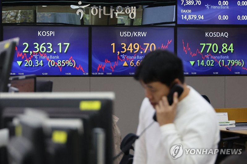 이날 오전 9시 25분 현재 코스피는 전날 종가보다 36.12포인트(1.53%) 떨어진 2,327.05로 집계됐다.
