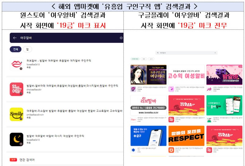 변 의원에 따르면 구글플레이에서 '유흥업소 구인구직'을 검색하면 결과로 나오는 앱에는 청소년유해표시인 '19금' 마크가 나오지 않는다. 일부 앱은 청소년유해정보를 포함하고 있으면서도 이용가능 연령 등급은 3세이상~18세이상까지로 설정해 청소년이 접근 가능하도록 하고 있다.