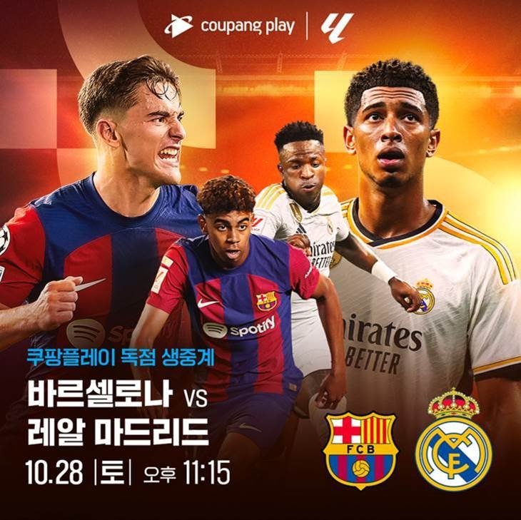 (서울=연합뉴스) 오명언 기자 이승미 인턴기자 = ▲ 쿠팡플레이, 라리가 바르셀로나 vs 레알 마드리드 생중계 = 쿠팡플레이가 오는 28일 오후 11시 15분(한국 시간)에 스페인 프로축구 프리메라리가(라리가) FC바르셀로나와 레알 마드리드의 경기를 생중계한다고 26일 밝혔다.