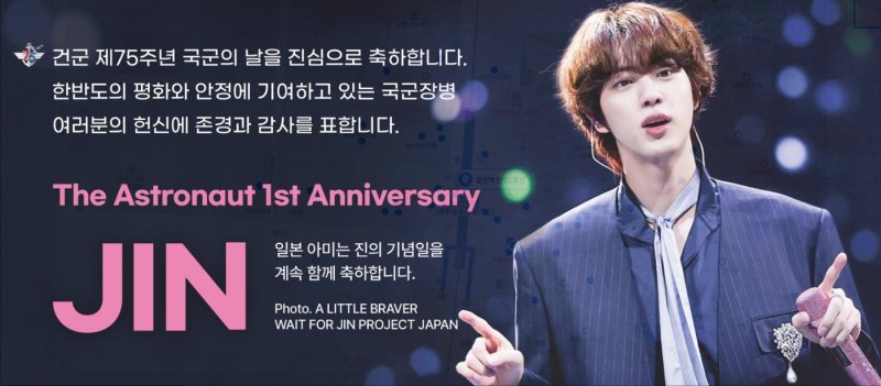 일본 아미는 현재 육군5보병사단에서 조교 임무를 수행하고 있는 BTS 멤버 김석진(예명 진) 상병의 첫 솔로 싱글 '디 애스트로넛'(The astronaut) 발매 1주년을 기념해 이번 광고 게재를 요청했다. 일본 아미는 광고에서 “일본 아미는 진의 기념일을 계속 함께 축하합니다”라는 글을 실었다. 광고 왼쪽에는 김 상병의 입대 전 사진을 담았다.