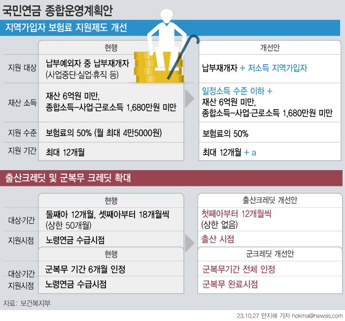 또한 출산과 동시에 크레딧을 인정하고 국고 부담 비율도 확대할 계획이다. 복지부 관계자는 이날 사전설명회에서 "(현행 30%인 국고 부담 비율을) 많이 올리고자 한다"면서 "지금보다는 국고부담을 많이 하도록 설계할 계획"이라고 했다.