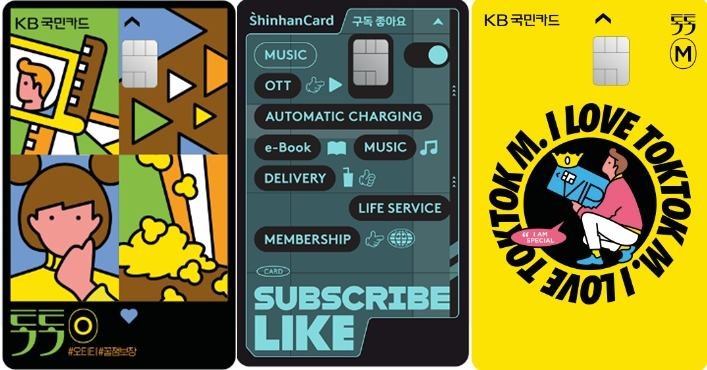 '톡톡O 카드(KB국민카드)'는 넷플릭스, 디즈니플러스, 웨이브, 왓챠, 티빙, 유튜브 등의 프리미엄 구독료를 100% 할인해 준다. 월 할인한도는 1만원이다. 이 외에 온라인 간편결제 10% 할인, 편의점 5% 할인, 대중교통 5% 할인 혜택을 제공한다.