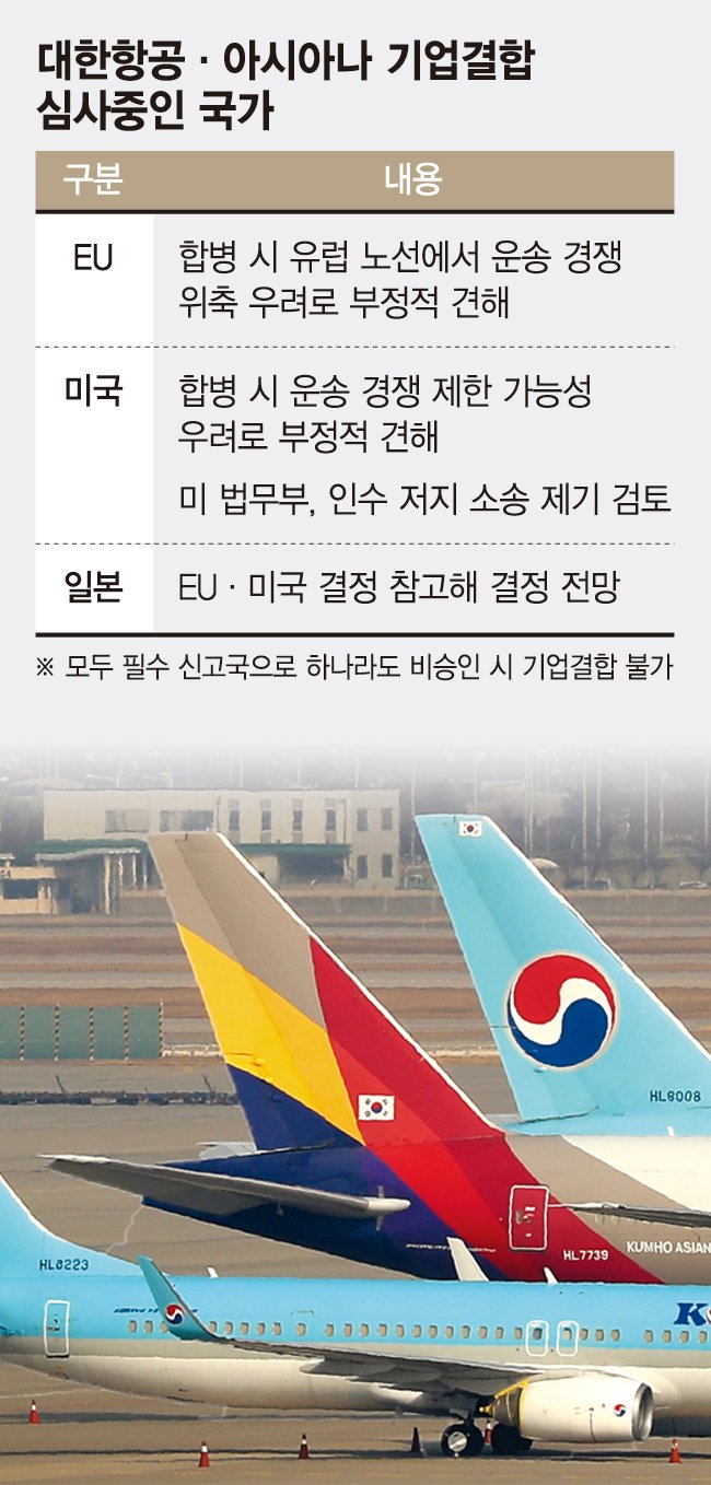 EU가 대한항공의 시정조치안을 받아들이면 대한항공·아시아나항공 기업결합은 가장 큰 난관을 넘게 된다. 지난 2020년 11월 대한항공이 아시아나항공 인수 추진을 발표한 이후 우리나라 공정거래위원회를 포함해 14개국 경쟁당국으로부터 기업결합 승인을 추진, 현재 11개국으로부터 승인을 받았고 EU, 미국, 일본만 남겨두고 있다.
