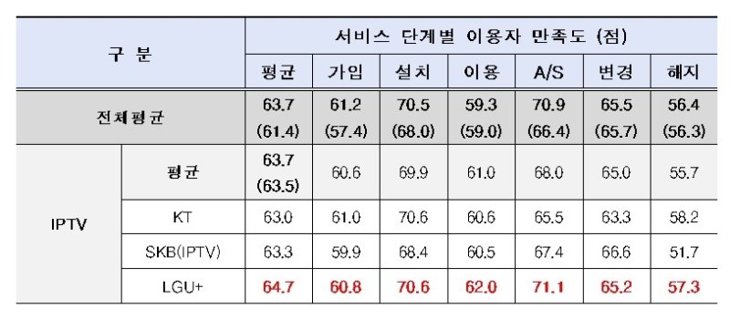가입, 설치, 이용, A/S, 변경, 해지 등 서비스 단계별 이용자 만족도를 종합했을 때 평균 점수가 가장 높은 IPTV사는 LG유플러스(64.7점)였다. SK브로드밴드는 63.3점, KT는 63.0점을 받았다.