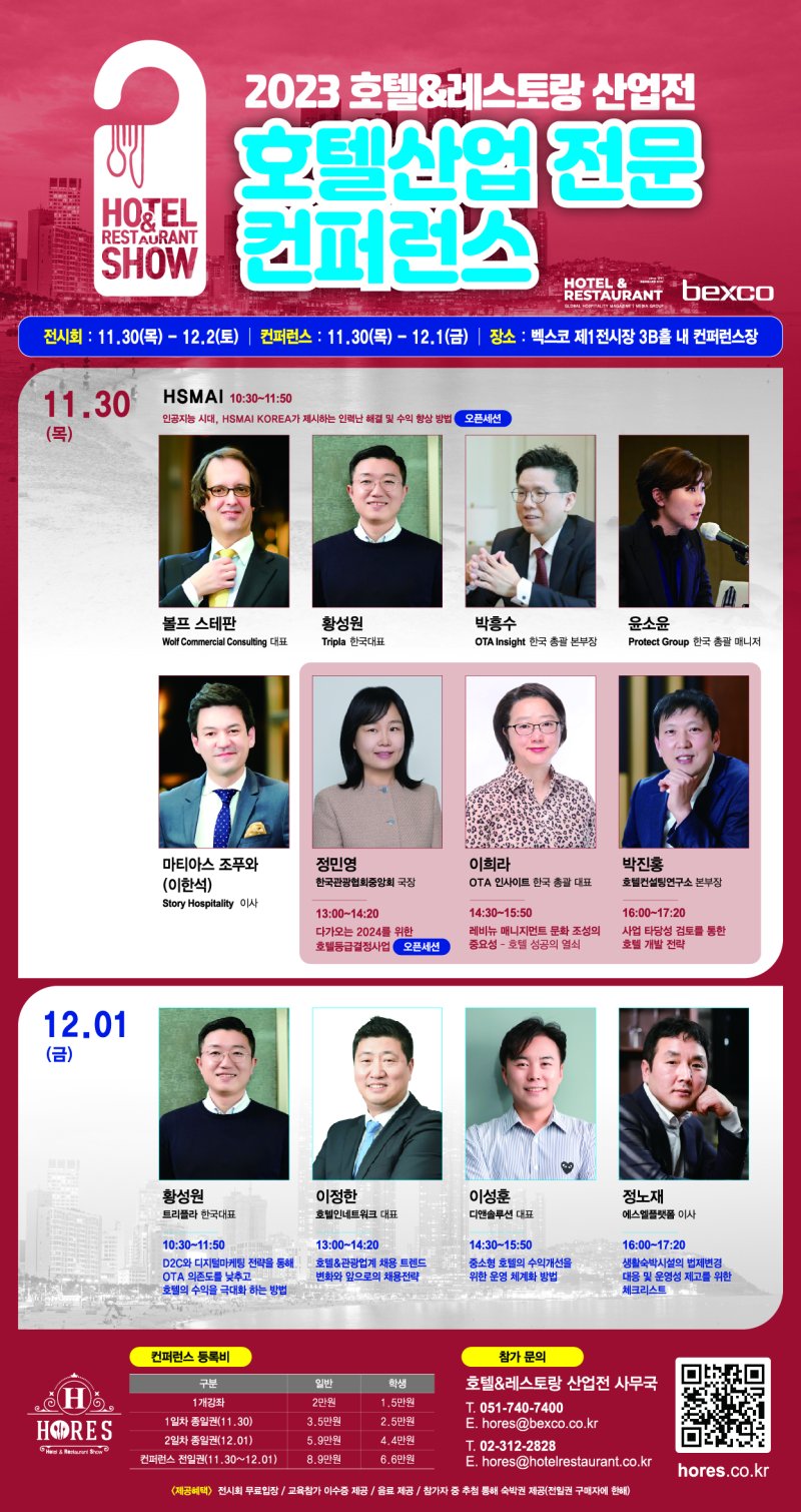 행사의 대표 이벤트인 호텔산업 전문 컨퍼런스에서는 이달 30일과 12월 1일 이틀간 업계 전문가 8명의 강연이 펼쳐진다.