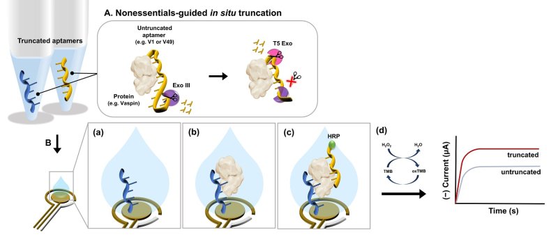 본 연구팀은 이러한 후속 개발 과정에서 앱타머를 고성능화하는 최적화의 일환으로, 앱타머를 표적 물질에 결합한 채로 결합하지 않은 부위를 핵산 외부 가수분해 효소 2종으로 양방향에서 잘라내는 'nonessentials-guided in situ truncation' 방법을 최초로 개발, 성공적으로 적용했다.