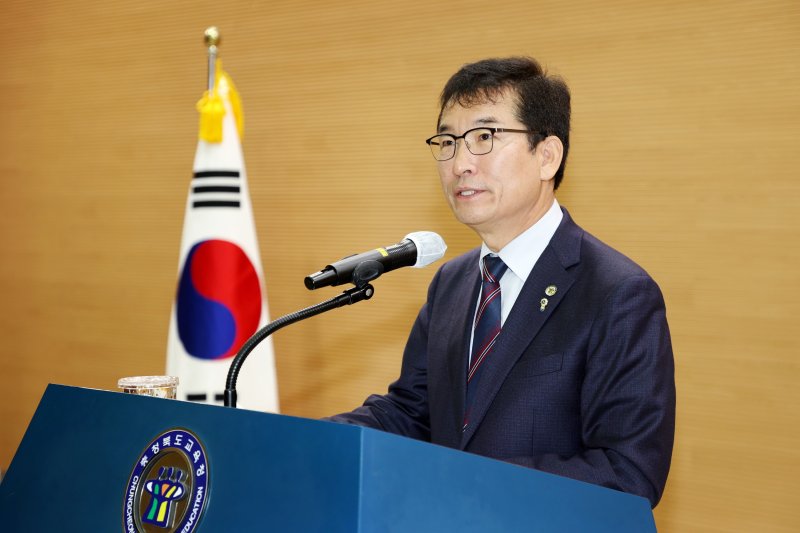(청주=뉴스1) 이성기 기자 = 윤건영 충북도교육감이 1일 본청 사랑관 세미나실 열린 월례회의에서 "11월은 흘린 땀을 점검하며 좋은 결과를 거두기 위한 '무한불성(無汗不成)'의 달"이라며 "땀이 없으면 이뤄지는 것이 없다는 뜻으로 다양한 형태의 노력을 통해 지속 가능한 공감·동행 교육을 실현하자"고 했다.