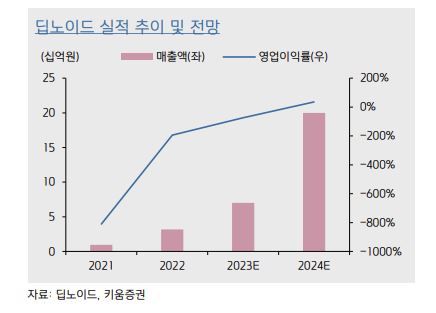 오 연구원은 “동사의 매출액은 2023년 70억원(YoY 120%), 2024년 200억원(YoY 186%)을, 영업이익은 23년 적자 규모 축소에 이어 24년 70억원으로 흑자 전환이 전망된다”라며 “실제 최근 75억원 규모의 2차전지 비전 시스템 공급 계약 공시를 통해 24년 성장 가시성은 높아진 것으로 판단한다”라고 말했다. 이어 “이익 체력이 견조하거나 2024년 성장 가시성 큰 업체들 중, 낙폭 과도하다고 판단되는 업체로 딥노이드를 추천한다”라며 “동사는 산업용 AI 솔루션 진출 통해, 내년 성장과 실적이 기대된다”라고 덧붙였다.