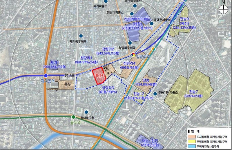 용두1-6구역은 청량리 광역 중심에서 추진되는 '사전기획 공공재개발'에 따라 ▲용도지역 상향(일반상업·준주거→ 일반상업지역) ▲높이 상향(90m 이하→ 200m 이하)을 통해 계획된 용적률을 1100%까지 높이며, 977세대 공동주택과 오피스텔 120실로 거듭난다.