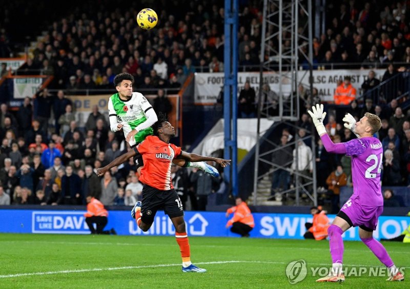루이스 디아스, 경기 종료 직전 동점 골 TOPSHOT - Liverpool's Colombian midfielder #07 Luis Diaz scores the equalising goal during the English Premier League football match between Luton Town and Liverpool at Kenilworth Road in Luton, north of London on November 5, 2023. (Photo by JUSTIN TALLIS / AFP) / RESTRICTED TO EDITORIAL USE. No use with unauthorized audio, video, data, fixture lists, club/league logos or 'live' services. Online in-match use limited to 120 images. An additional 40 images may be used in extra time. No video emulation. Social media in-match use limited to 120 images. An additional 40 images may be used in extra time. No use in betting publications, games or single club/league/player publications. / (서울=연합뉴스) 설하은 기자 = 잉글랜드 프로축구 프리미어리그(EPL) 루턴타운의 일부 팬이 리버풀전에서 '힐스버러 참사' 관련한 구호를 외친 것에 대해 구단이 공식 사과했다.
