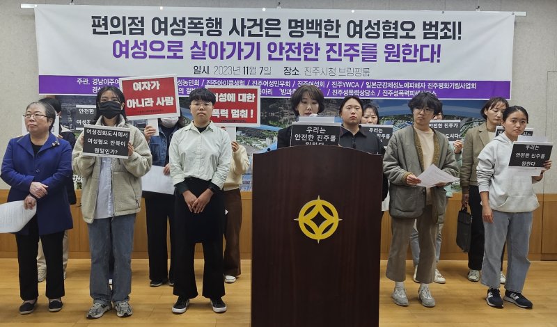 경남 진주지역 여성단체, 정당, 시민사회단체 등 30여개 단체들은 7일 진주시청 브리핑룸에서 기자회견을 열고 편의점 아르바이트 여성을 무차별 폭행한 남성의 엄벌을 촉구했다.