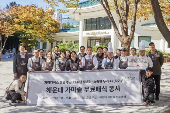(서울=뉴스1) 서미선 기자 = 파라다이스(034230) 호텔 부산과 파라다이스 카지노 부산은 창립 42주년 기념 '소중한 우리 42(사이)' 캠페인 일환으로 7일 지역 소외이웃에게 배식 봉사활동을 펼쳤다고 8일 밝혔다.