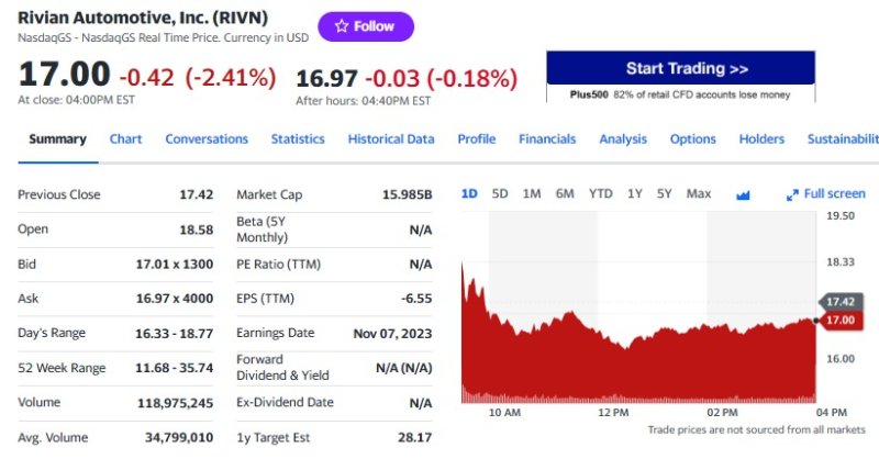 8일(현지시간) 뉴욕증시에서 리비안은 전거래일보다 2.41% 하락한 17달러를 기록했다.