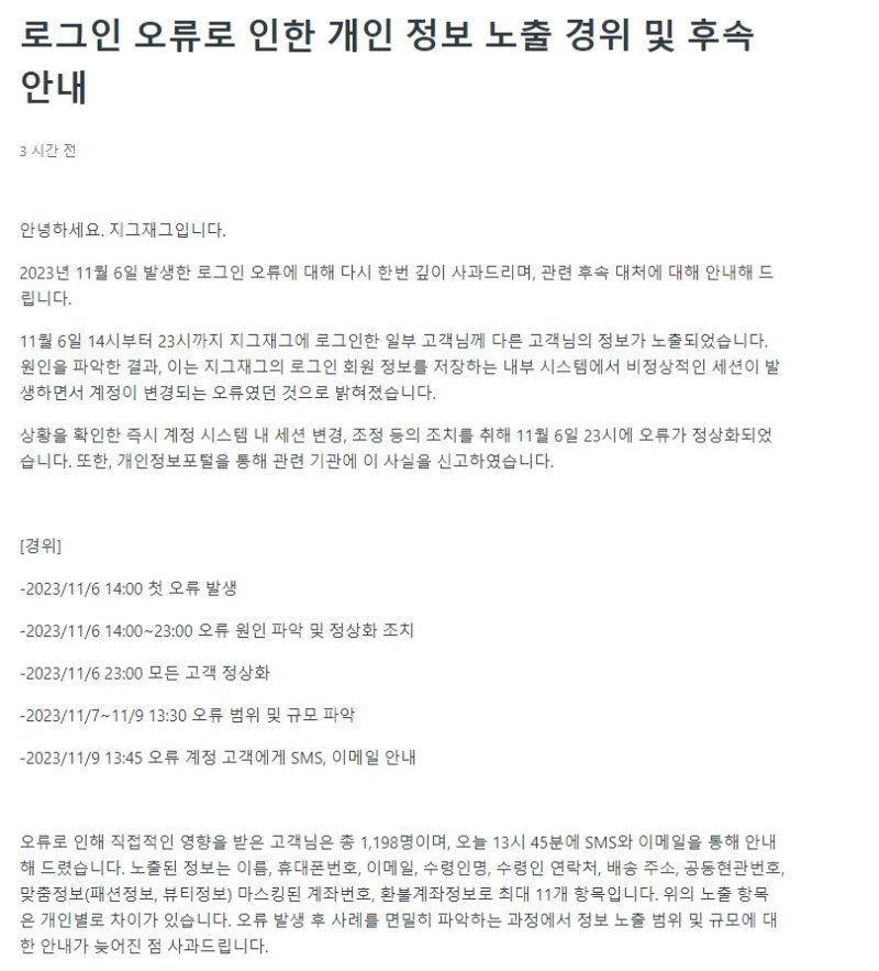앞서 지그재그는 정확한 피해 규모 확인 후 보상·재발방지 대책을 공지하겠다고 밝혔으나, 이날 공지사항에 구체적인 보상안은 담기지 않았다.