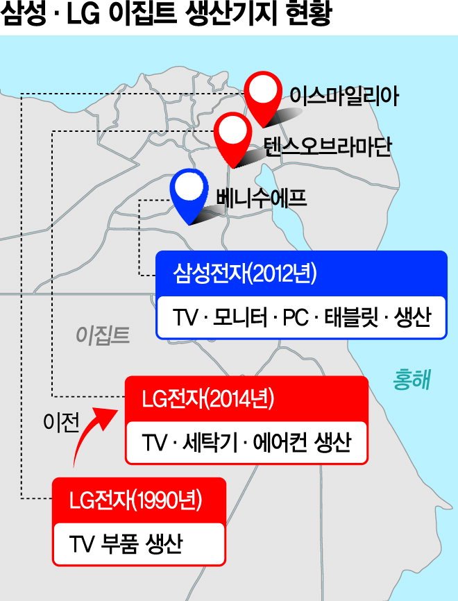 LG전자는 1990년 이집트에 진출하며 중동·아프리카 지역에 처음으로 한국 공장을 설립했다. 이집트 북부 항구도시 이스마일리아에 생산법인을 설립해 그다음 해부터 TV 부품 제조를 시작했다. 2014년 텐스오브라마단으로 공장을 이전해 TV와 세탁기, 에어컨 등을 생산 중이다. 지난해 생산량은 TV 150만대, 세탁기 50만대였다. LG전자 또한 현지 공장의 생산품 대부분을 인근 중동·아프리카 등으로 재수출하고 있다.